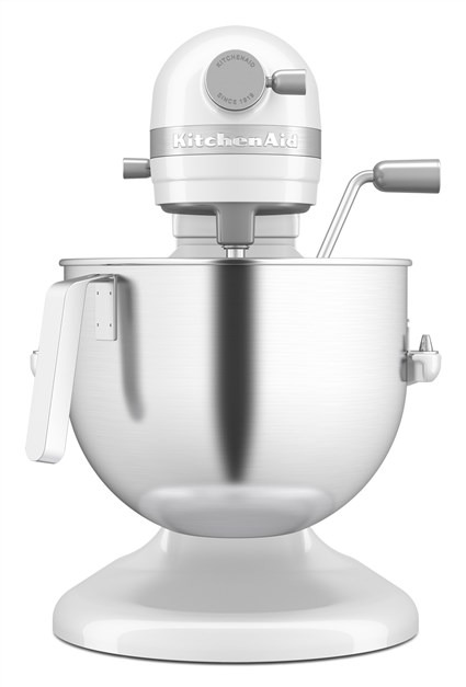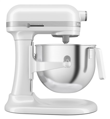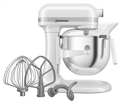 – Bol de acero inox. pulido con asa de correa de 5,2L, batidor plano con revestimiento blanco, batidor metálico de 6 varillas, batidor de gancho amasador con revestimiento blanco.