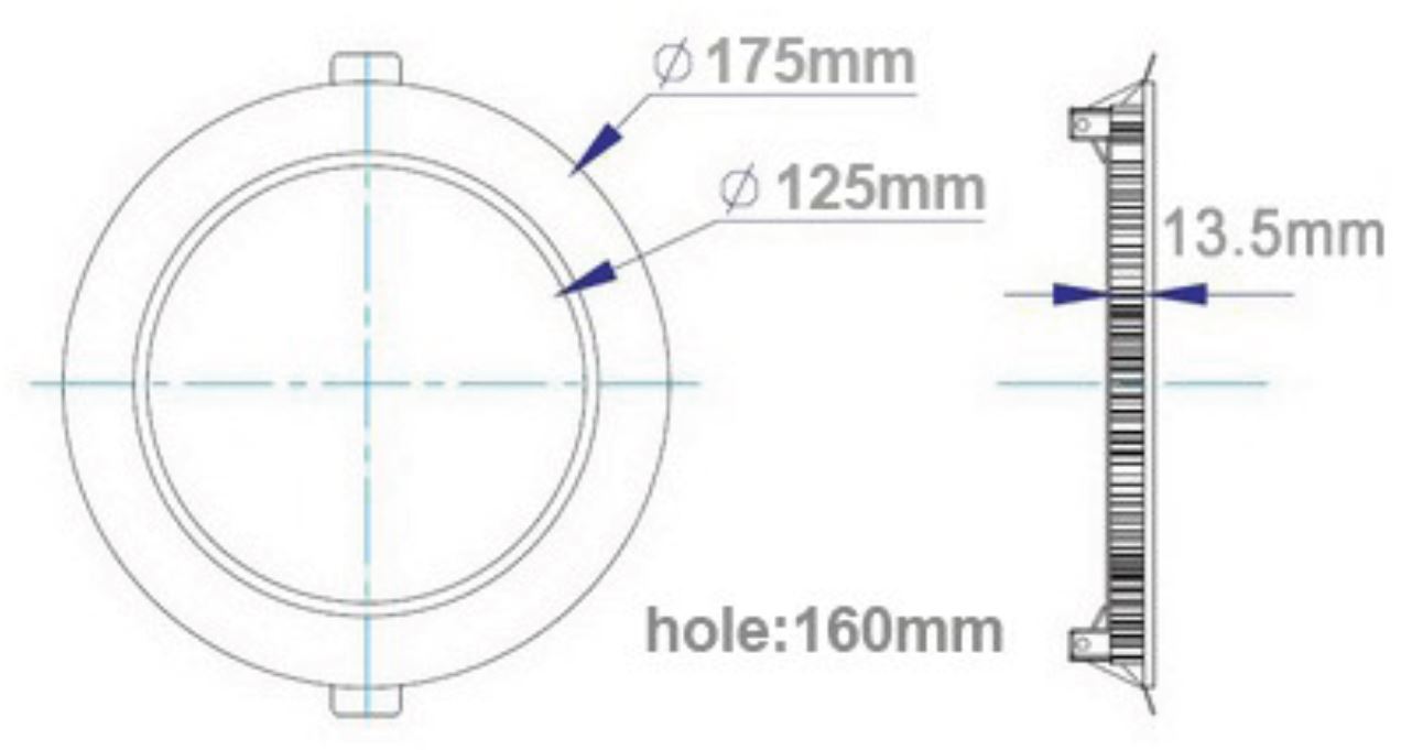 Lámpara downlight circular ultra fino fabricado en aluminio Int 125mm/Ext 175mm Int 15 de 12 W, CRI70, ángulo de luz de 120º. Haz de luz simétrico con elevado índice PMMA de transmisión lumínica. Color Blanco. Empotrable de fácil instalación. Radiador de Aluminio ADC12 con Driver de alta calidad. Temperatura de color: 4000K.