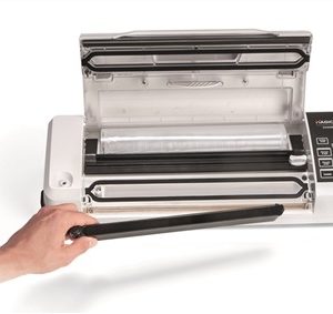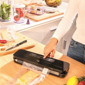 – Incluye: guía para el almacenamiento de alimentos al vacío, tubo de conexión para accesorios, cutter «Magic» cortador para bolsas y 5 bolsas precortadas de 20×30 cm.